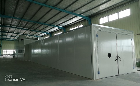 烘干室采用热风循环燃气间接加热的方式进行。通过循环风机及管道,加热后的空气进入烘干室内与工件进行热交换,实现对工件的升温加热,换热后的空气由回风管收集,与补充的新鲜空气一起返回到加热室,形成内循环。经过重复的循环,从而使工件表面温度升至规定温度。当温度达到设定值时,加热器自动停止工作