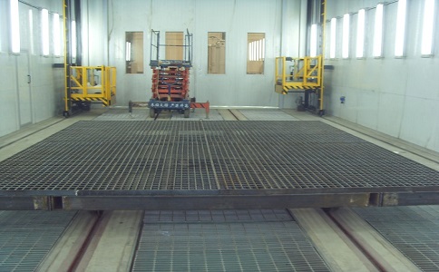 以气流方向划分为三类。 大件线喷漆室 横流式喷漆房: 气流从房的一端流向另一端。此种机型成本低,易安装。缺点是雾状物沿着车身侧面移动,且雾气不能从操作者的面部周围除去,工作环境不尽人意。