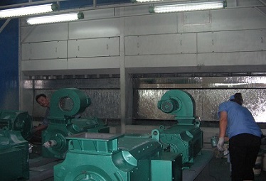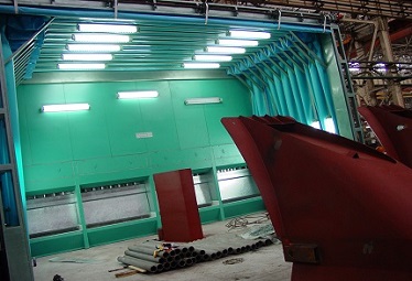 照明系统无泵水幕喷漆室内设置上、下两排照明装置。顶侧灯组呈45º角安装,布置方式为:2支×40W×2侧;腰侧灯组间隔安装于墙板内,布置方式为:2支×40W×2行。所有灯箱均采用δ1.2镀锌板制作,并喷白漆美观大方,又可防止锈迹象产生。灯管采用隔爆型飞利浦高效光源,既安全又节能且维护方便,镇流器采用喷漆室专用电子镇流器,从而保证每个喷漆室体光强≥800Lux,满足工件各端面的喷涂作业。灯箱与壁板用小角铁相连,同时灯箱上安有可拆框架,便于维护。 | ![]() |