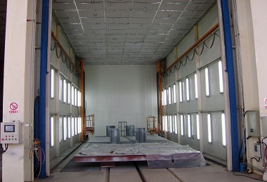 干式喷漆房室体内、外壁板采用厚度δ0.5mm 镀锌钢板,中间填充夹心保温层岩棉,岩棉δ50mm 厚,密度为 120kg/m³,使外壁板温度不高于室温 5℃,传热系数不大于 0.38Kcal/㎡.h.℃,平均隔音量不小于 21.5R(dB);耐盐雾性能≮500h,接地电阻不大于100Ω,具有美观耐用、密封效果佳、保温隔热效果好、抗冲击性优良等优势。 | 从供风系统送来的新鲜风进入静压室,经过高效型空气过滤棉,气流流向操作间更均匀,高效过滤棉选用荷兰进口“FILTRAIR”产品。静压室设有型钢骨架,顶网为优质C型钢结构,经特殊防锈处理,钢性好、无锈蚀、更换顶棉容易。 | 选用欧式卷帘门,新型金属材料双层辊压成型,中间填充不含碳氢氟化物的聚氨酯绝热发泡材料,保温、抗弯性好,且防止冷凝水出现;双层中空铝合金门片,厚度达2.4毫米,坚固耐用;型材表面为多层烤漆或薄膜层,具有优良的抗划伤性能,抗腐蚀、不腐化、耐磨、抗敲打、抗撞击;在启动运行过程中,快捷且无噪音(速度可达约0.1m/s,噪音小于58分贝)。 | 地坑在格栅下落地面约1200mm,且此通道两旁每间隔1500mm设置照明一组,以方便对结构件底部喷漆。两轨道外侧地坑上部按地坪高度铺设格栅,中间布置有漆雾过滤玻璃纤维棉。 | 室体底部设有地坑,上面铺设格栅板,格栅板加工形成后全部热浸锌,避免由于工件喷漆时装饰带划线、贴报纸产生的废报纸、废胶带等进入地下构筑物部分;由40X3mm扁钢及Ø8园钢焊接而成,其承重力不小于500Kg/㎡ ;为便于拆卸和清洗,每块面积大约1㎡,重量≦25Kg/m2 |